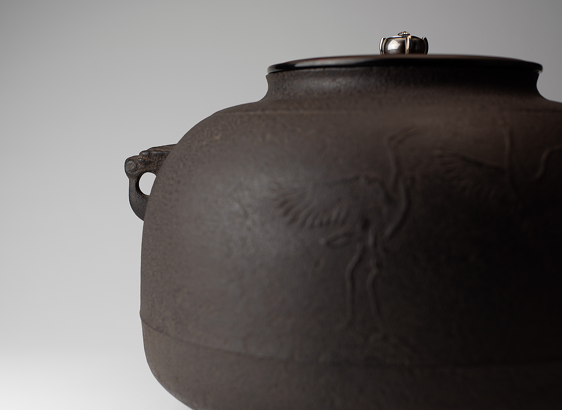 This exceptional Tea Ceremony Iron Kettle (Chagama) integrates the poetic imagery of the late Atsushi Uemura, a Living National Treasure2 and one of the foremost Nihonga painters of the modern era. His original crane drawing has been delicately engraved across the iron surface, creating a rare dialogue between metalwork and painting.